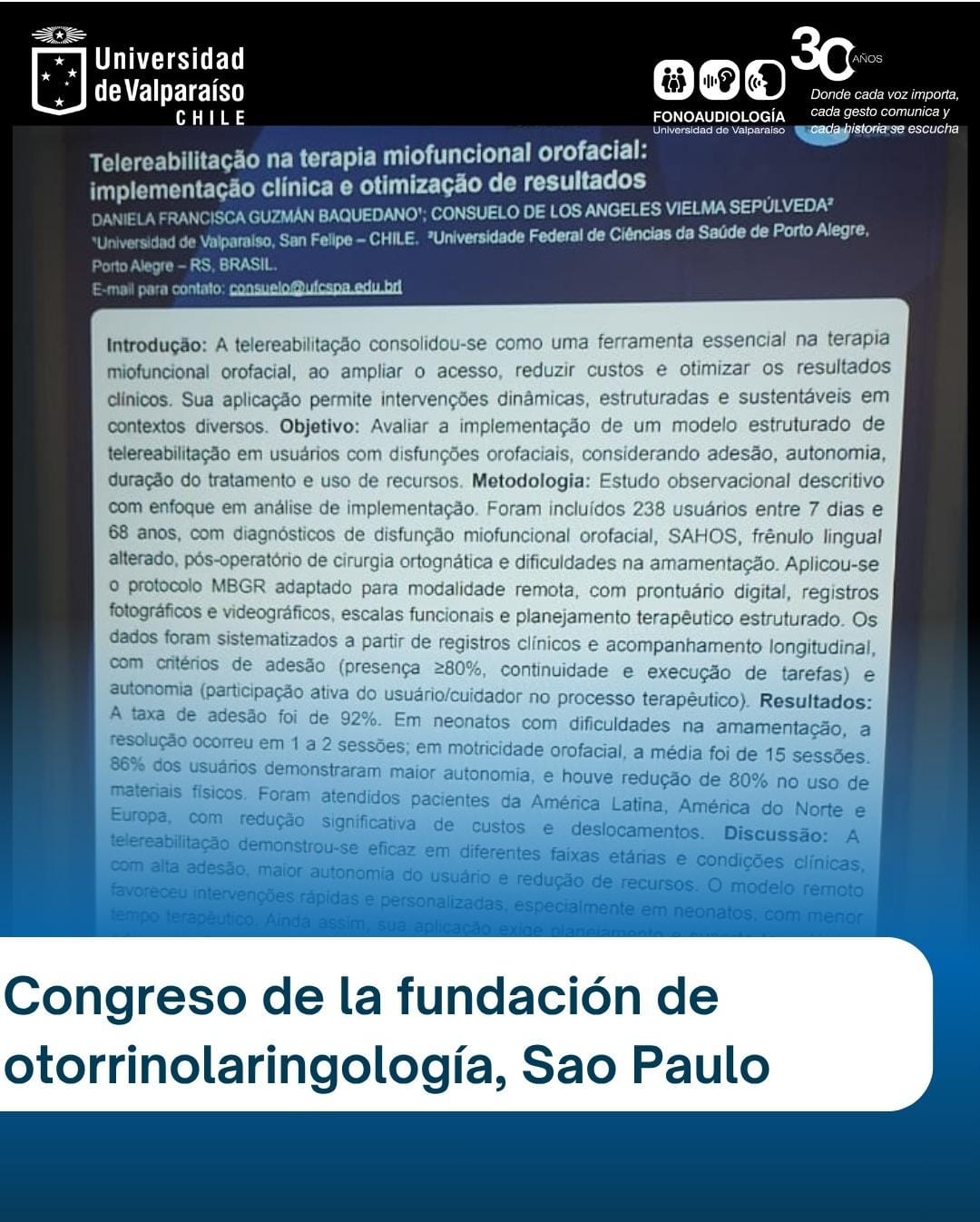 La académica Daniela Guzmán participó entre el 21 y el 23 de agosto de 2025 en el XXIV Congreso de la Fundación de Otorrinolaringología 🇧🇷, el mayor encuentro nacional de Brasil que reúne a otorrinolaringólogos, fonoaudiólogos y profesionales de disciplinas afines.