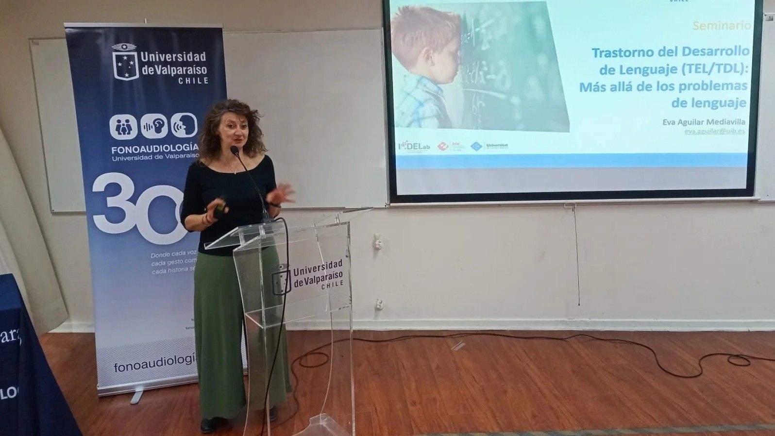 La versión 2025 del Coloquio en Cognición y Lenguaje de la UV concluyó con la intervención de la doctora en Psicología, logopeda y académica de la Universidad de Islas Baleares Eva Aguilar Mendiavilla, quien dictó la conferencia titulada “Trastorno del Desarrollo del Lenguaje (TDL): más allá de los problemas del lenguaje”.