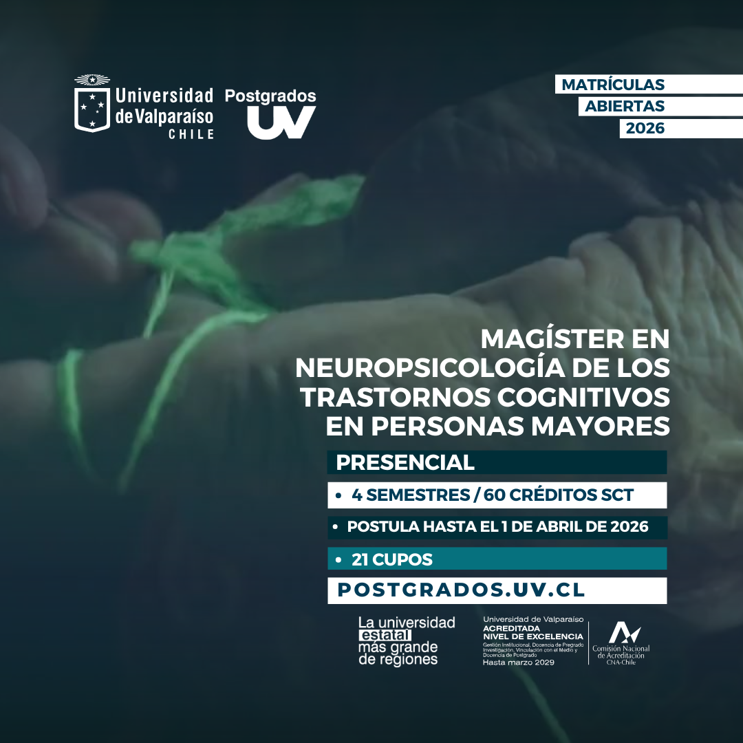 El magister de Neuropsicología de los trastornos cognitivos en personas mayores de la Facultad de Medicina de la Universidad de Valparaíso es un programa de tipo profesional que busca articularse cohenretemente con los objetivos establecido en el Plan Nacional de Demencia, especialmente en la formación de profesionales especialisyas en diagnóstico e intervenciín en personas mayores con trastornos cognitivos.
